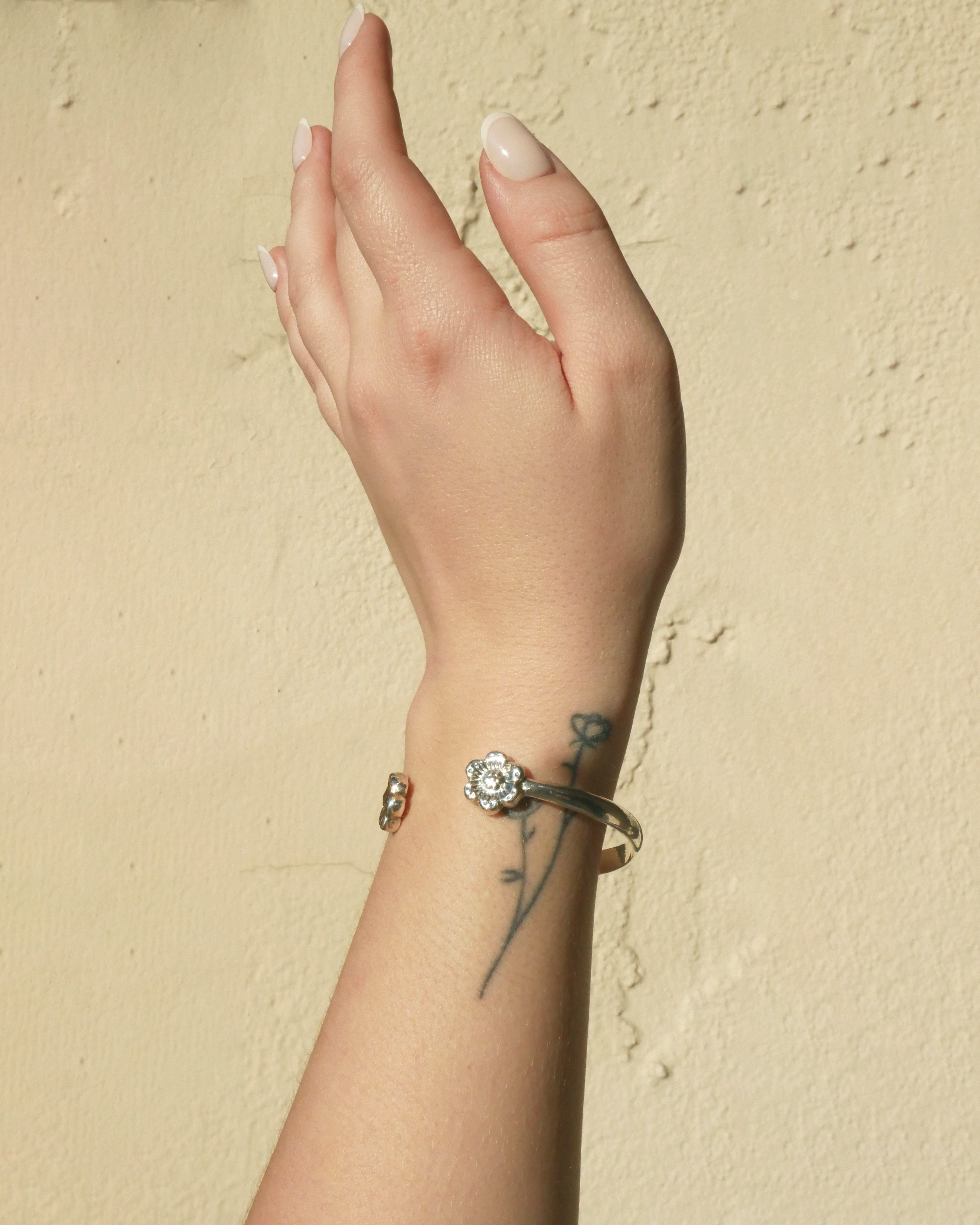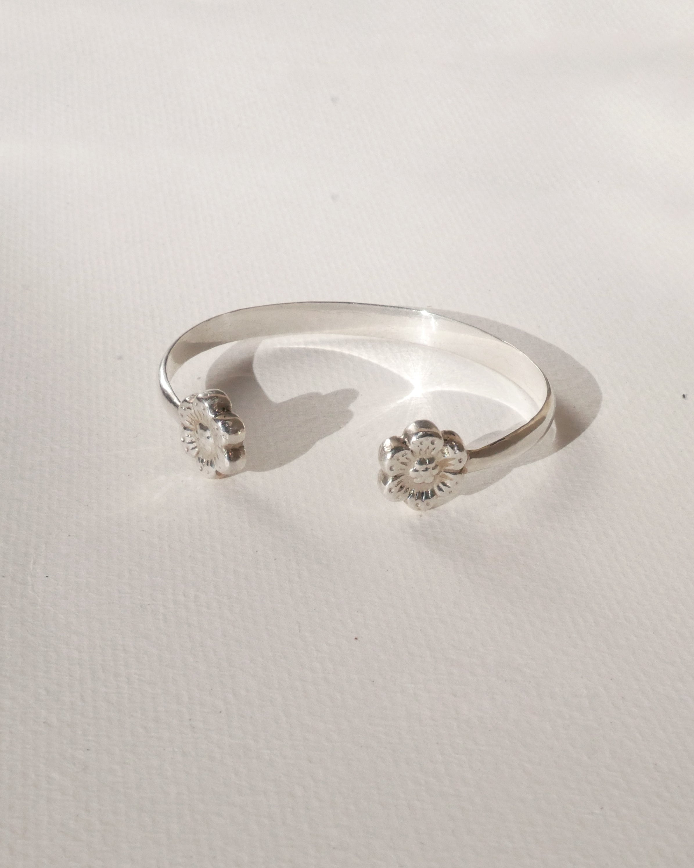 An easy to wear cuff with two symmetrical hand casted flowers.
