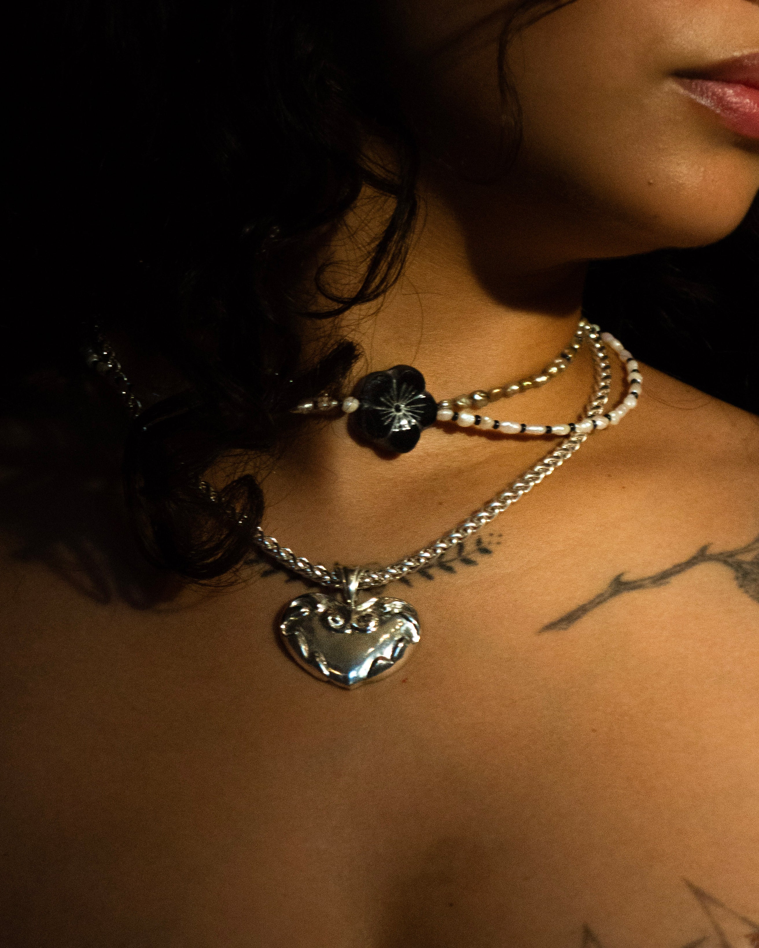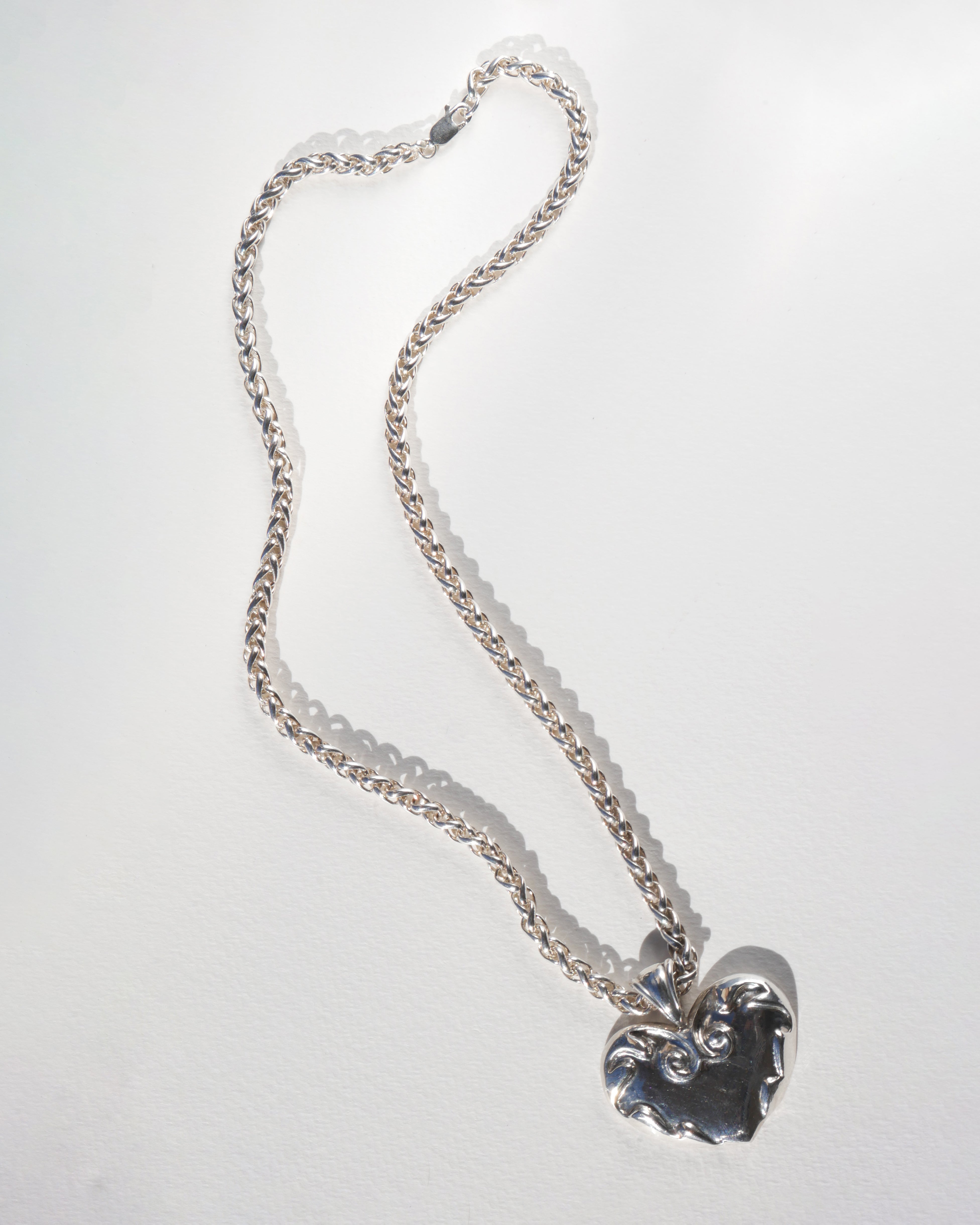 Solid hand casted sterling silver heart pendant with an intricately woven chain design.